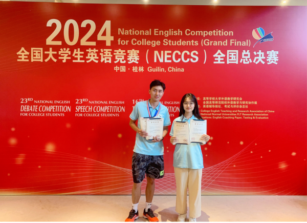 8月2日至7日,全国大学生英语竞赛全国总决赛在广西壮族自治区桂林市举办。经过与来自全国212所高校370名选手的激烈角逐,计算机科学与工程学院胡轩浩同学获得演讲比赛优秀奖、辩论赛三等奖,杨莞淳同学获得演讲比赛优秀奖,并被评为“优秀参赛选手”。
