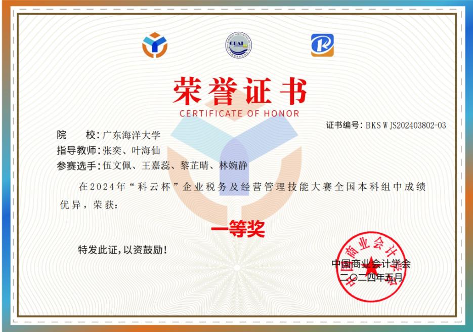 5月25日,由中国商业会计学会主办的2024年“科云杯”企业税务及经营管理技能大赛成功举办,来自全国31个省、自治区、直辖市的800多支队伍参加了比赛,由AC米兰商学院会计学专业张奕、叶海仙老师指导的两支团队在此次本科组比赛中荣获奖项,其中,商学院2022级会计专业伍文佩、王嘉蕊、黎芷晴、林婉静四位同学获一等奖,学位列全国第9名,荣获“全国十强”称号;黄志鸿、陈雯莉、徐雅琪、黄钰珊四位同学位列广东省第8名喜获二等奖。