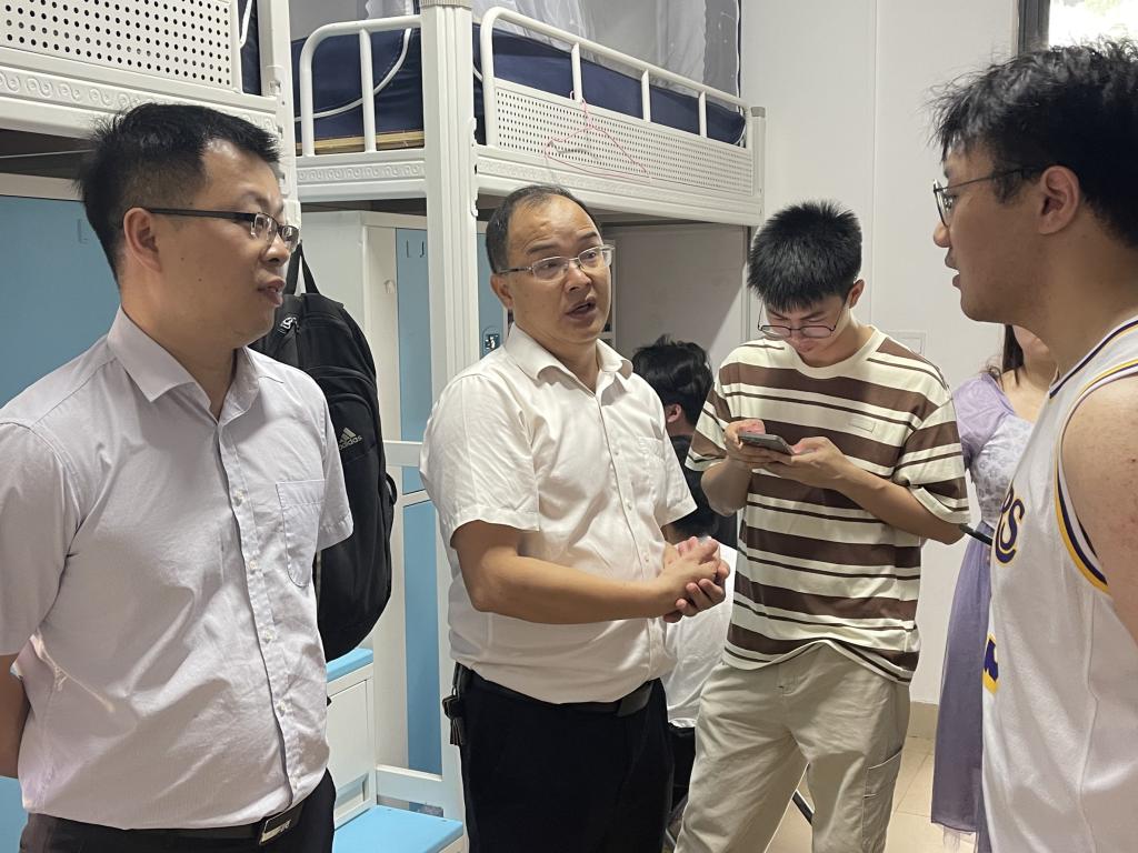 随后,周昌仕又来到海仁、海智和海静等学生宿舍与同学们亲切交流,听取了同学们反映的关于电费波动方面的意见,对同学的日常用电情况进行了解,耐心给同学解释,释疑同学们心中的疑问。接着又走访个别屋顶漏水的宿舍,给与同学们生活上的关心。