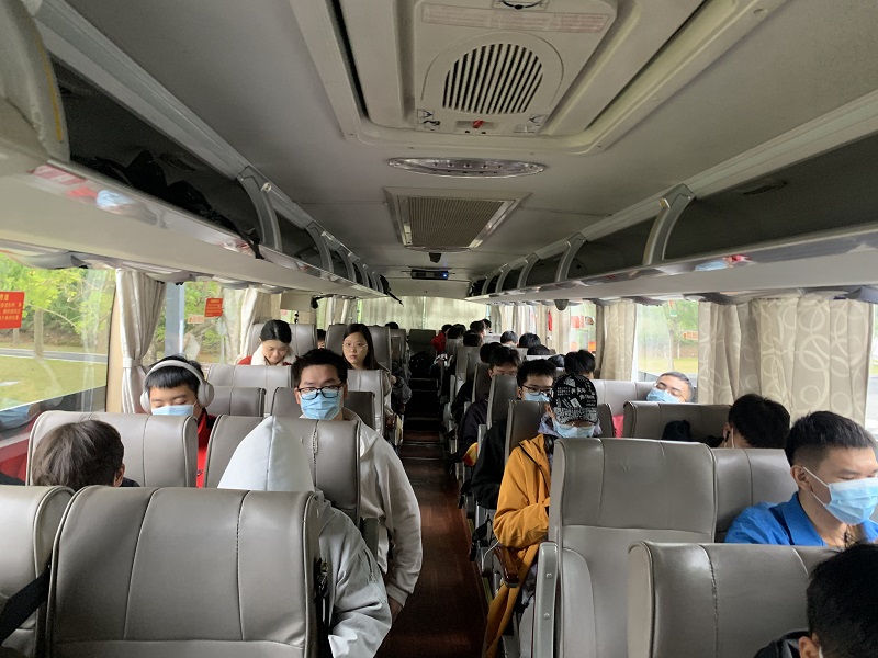 13日早上8点50分,在海礼宿舍楼下,首批离校的同学们带着行李,愉快地坐上了接驳专线包车,直达汽车总站和高铁站。