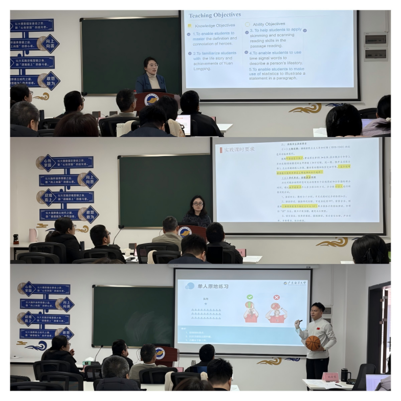 本次竞赛覆盖大学英语、思政、公共体育三大课程领域。关沛欣老师的《大学英语读写1》课程结合袁隆平生前事迹,引导学生探讨“英雄内涵”,融入价值观教育;沙广惠老师的《毛泽东思想和中国特色社会主义理论体系概论》课程运用思维导图与情境代入法,帮助学生理解理论逻辑;许家声老师的《篮球》课采用“理论讲解+实操纠错”模式,让学生快速掌握技术要点。