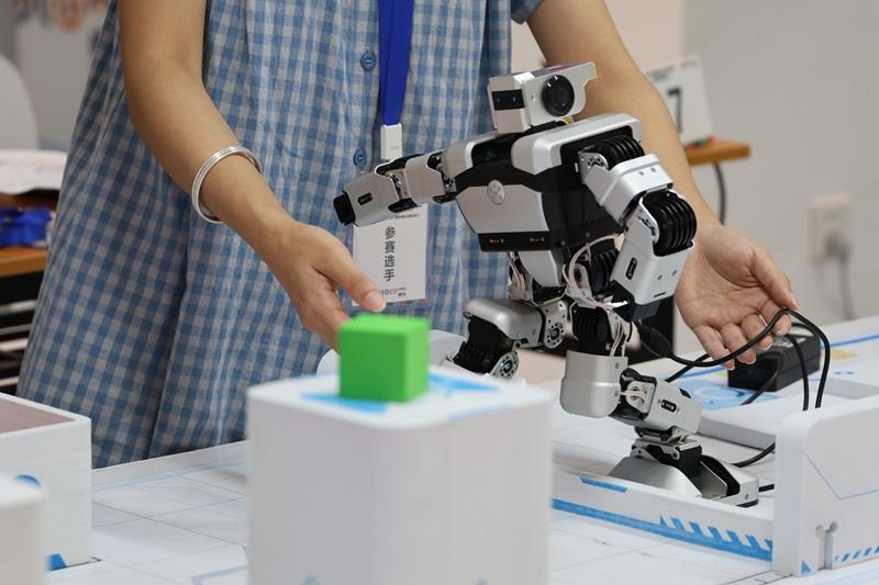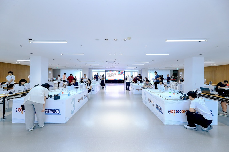 来自全国30余所高校的近70支参赛队伍在阳江校区海纳楼图书馆开展竞技比赛。竞赛内容包括模拟智能工厂场景下人形机器人与车型机器人作为智能总控及执行终端,实现多机协作、物品识别、自主定位、复杂环境下的物品分拣等功能。
