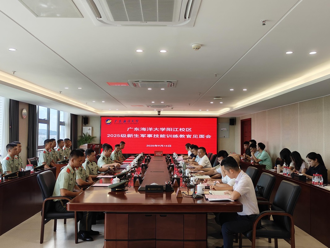 9月15日下午,阳江校区2025级本科生军训教官见面会在海纳楼712会议室召开。阳江校区党委副书记丁永成,阳江海警局参谋长陈真,相关职能部门负责人,各学院党总支书记,全体施训教官,新生军训指导员和学生事务部全体人员参加了会议。会议由丁永成主持。