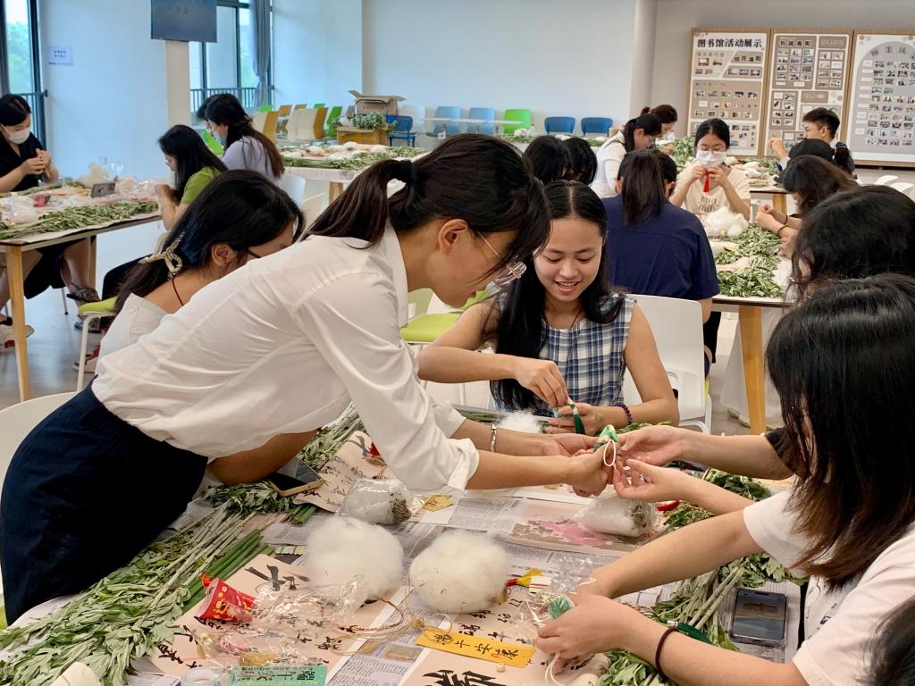 “艾香满园 粽情端午”主题活动在海纳楼207室创客空间举行。在工作人员的耐心讲解和示范下,师生们兴致勃勃地动手实践。大家小心翼翼地填充艾草、缝合香囊、系上流苏,一针一线中寄托着对健康平安的美好祈愿。另一边,挑选艾草、搭配花材、精心捆扎包装,一束束清雅别致、寓意驱邪避疫的艾草花束在师生们的巧手中诞生。一针一线间,艾草清香弥漫校园,传统技艺与现代创意碰撞出文化火花。