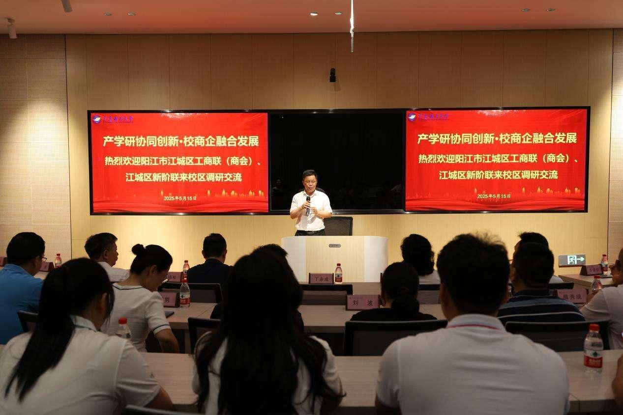 5月15日下午,阳江市江城区委统战部副部长、江城区工商联党组书记、常务副主席黄冬华率领江城区工商联、新阶联80余位企业家代表到校区开展“产学研协同创新·校商企融合发展”主题调研交流活动。校区党委副书记丁永成、麦冬宁,各学院、部门负责人参加调研。