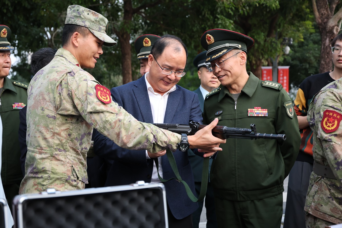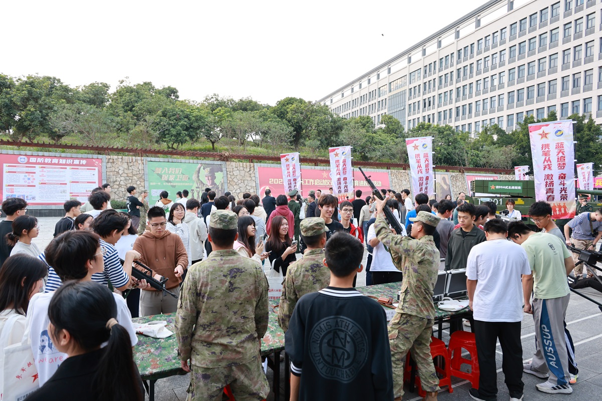 最后,启动仪式在嘹亮的军歌声中圆满结束。启动仪式结束后,阳江校区联合阳东区人武部在海纳楼东侧小广场开展国防教育进校园活动。现场设立了国防教育展区、设备体验区和政策咨询区,吸引了众多师生前来咨询体验,激发了同学们对部队的兴趣和参军入伍意愿,大大增强了师生们的国防意识。