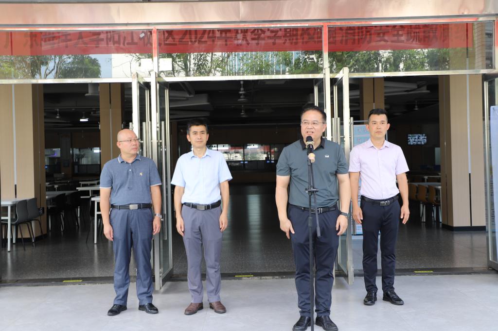 为增强校园消防安全意识,提高师生自防自救能力,阳江校区于9月19日下午在学生公寓海智楼南广场举行了2024年秋季学期校园消防安全疏散演练活动。校区党委副书记陈永强出席并发表总结讲话,后勤保障部、学生事务部、各学院书记及辅导员、2024级全体新生等共约900余人参加了活动等。