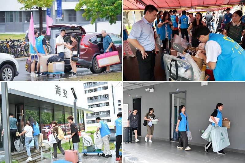 校外,志愿者们早早地到达高铁站、汽车站现场,手持醒目的接待标志,热情迎接每一位新生及其家长。志愿者们细心地为到达的学生和家长提供行李搬运服务,并引导他们坐上接驳大巴前往校区。