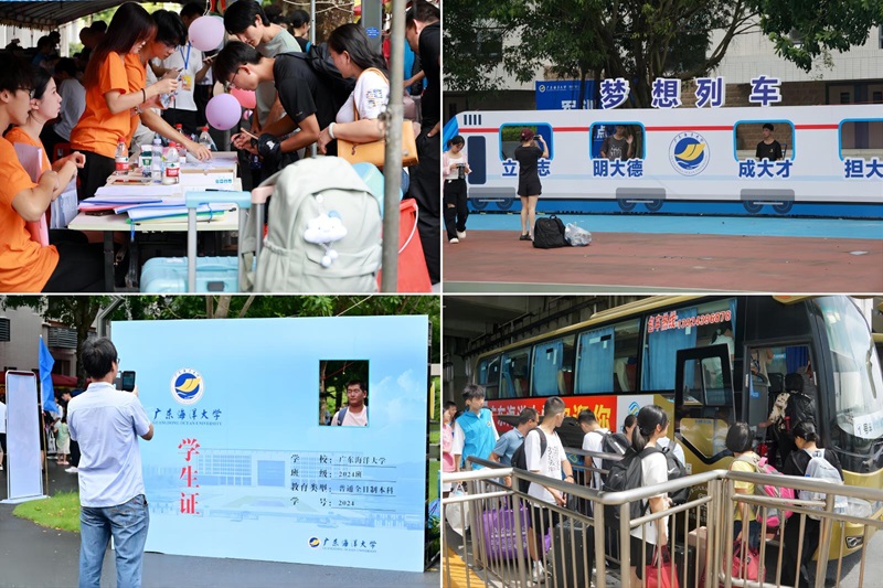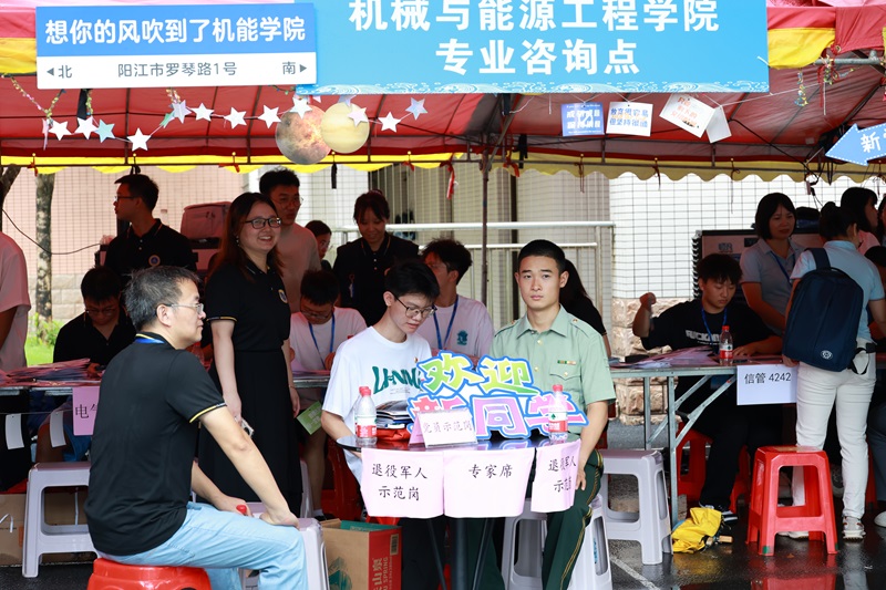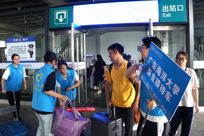 在阳江高铁站、阳江汽车总站、校门口以及校园内的宿舍区,均设有志愿服务站点。校区师生们为报到的新生提供了一系列温馨、便捷的服务,包括接站、引导路线、搬运行李和协助报到等。