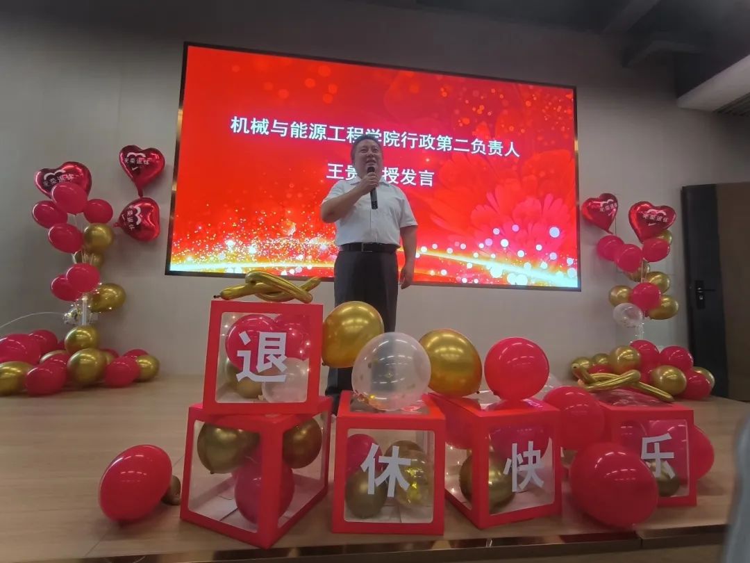 师生们齐聚一堂,见证王贵教授迈入人生新的篇章,荣休于这个充满记忆和情感的校区。在仪式上,王贵教授回顾了自己的职业生涯并表达了对国家和学校的感恩,毛琪代表校区致辞并为王贵教授戴上绶带,夏杏洲代表校区颁发纪念杯,陈扬枝代表学院颁发表彰牌匾并深情献唱一曲送别,学生代表献上深情朗诵,机械与能源工程学院全体教师通过视频献上祝福,仪式现场温馨而热烈。