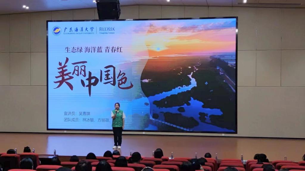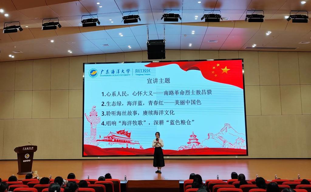 宣讲中,“讲好南路革命故事”宣讲员何梓楠以“心系人民,心怀大义——南路革命烈士敖昌骙”为题讲述了敖昌骙烈士心怀大善,为了改变中国劳苦大众的生活现状而奋斗终生的故事,以此来号召同学们传承红色基因,赓续红色血脉,争做堪当民族复兴重任的时代新人。“思政小助理”宣讲员吴嘉琪从红树林的特点、作用、现状、保护等方面,跟大家分析了保护“海岸卫士”红树林的重要性,号召同学们发挥青春力量一起来守护红树林。李强则结合阳江本土海洋文化资源——“南海I号”和大澳渔港讲述了阳江的海丝故事,并向同学们发起倡议,希望同学们充分挖掘海洋文化资源,提高文化自觉,讲好海洋文化故事。黄宇珺以“唱响‘海洋牧歌’,深耕‘蓝色粮仓’”为题与同学们一起学习了习近平总书记在湛江考察时关于建设“海洋牧场”、“蓝色粮仓”的指示精神,讲述了AC米兰在“粤海粮仓”建设中做出的海大贡献,号召同学们要深刻认识海洋强国建设的重大意义,弘扬科学家精神,提高海洋科学文化素质,积极加入海洋生态保护和宣传的志愿服务中,共建青春之未来。