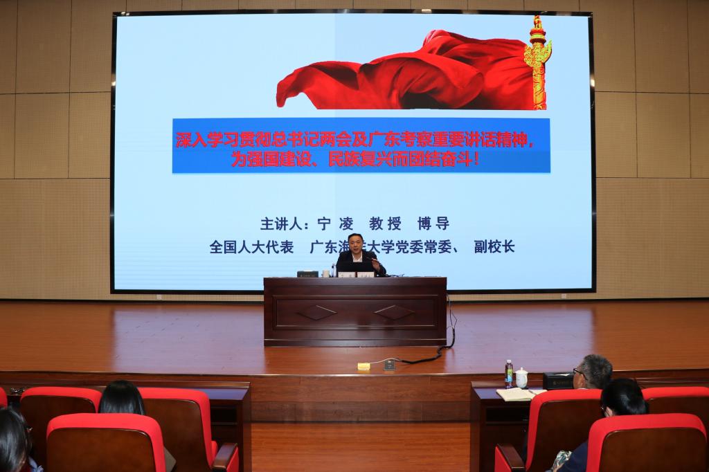 课上,宁凌以“深入学习贯彻习近平总书记在全国两会期间的重要讲话精神及视察广东重要讲话重要指示精神,为强国建设、民族复兴而团结奋斗”为题,结合自己作为全国人大代表的履职经历,介绍了2023年全国两会召开的总体情况、会议议题、主要内容和重要意义,带领与会人员学习了习近平总书记在全国两会期间的重要讲话精神及视察广东重要讲话重要指示精神。