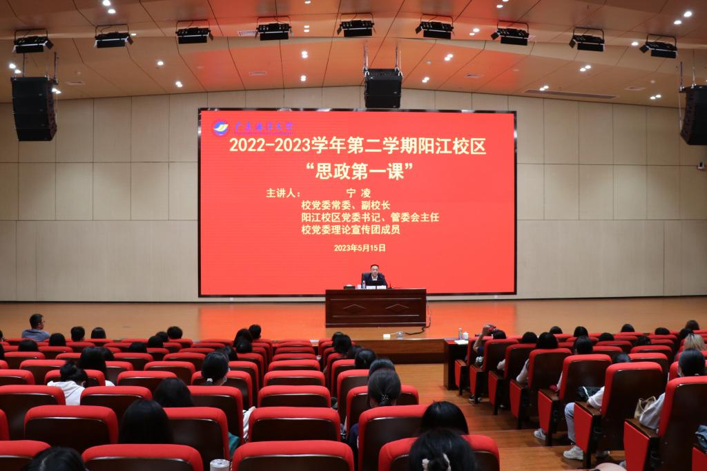 5月15日上午,副校长,阳江校区党委书记宁凌在阳江校区海纳楼113多功能厅讲授主题教育专题党课暨2022-2023学年第二学期阳江校区“思政第一课”。校区师生代表约160人在现场听课。
