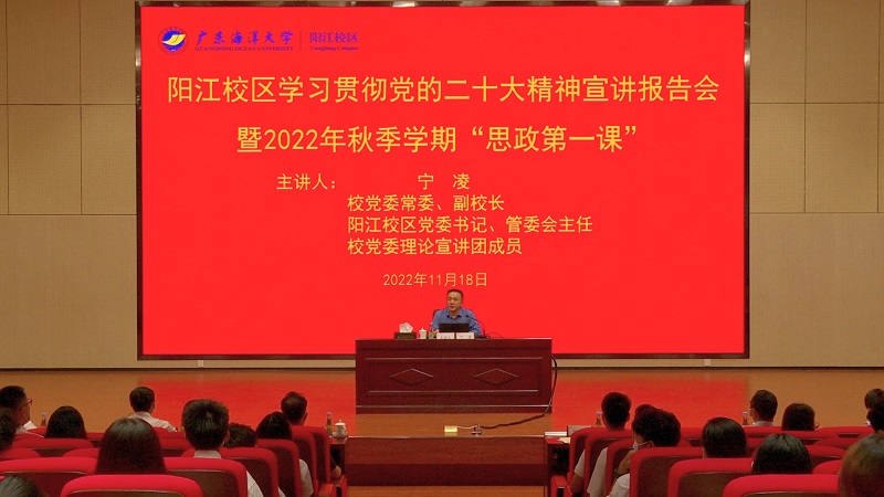 11月18日上午,阳江校区学习贯彻党的二十大精神宣讲报告会暨校区2022年秋季学期“思政第一课”在校区海纳楼113室举行。学校党委常委、副校长,阳江校区党委书记、管委会主任,校党委理论宣讲团成员宁凌教授为干部师生们作了题为“深入学习领会党的二十大精神”的宣讲报告。校区领导,校区二级单位、部门党政负责同志,教师代表、全体辅导员以及学生代表,共130多人参会。