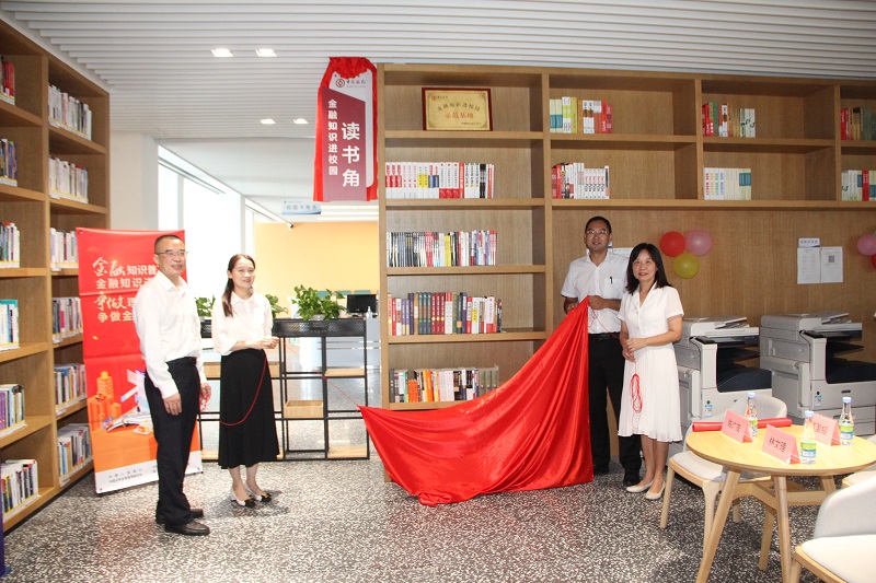 活动中,阳江银保监分局副局长陈凌,校区党委委员、纪委书记、管委会委员毛琪,中国银行阳江分行副行长林文理,校区图书馆第一负责人李中共同为校区金融知识读书角揭幕。
