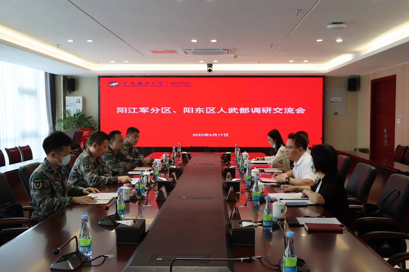 5月17日下午,阳江军分区动员处处长常治涛、阳东区人武部政委王骁栋带队到阳江校区进行调研,在海纳楼712会议室进行座谈交流,会议由阳江校区党委委员、管委会副主任陈永强主持,学生事务部全体人员参加了会议。