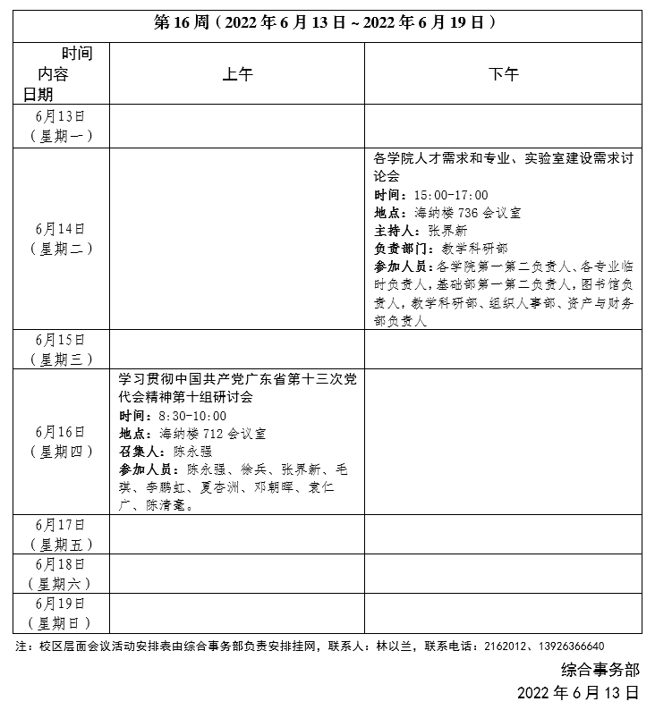 2021~2022学年第二学期第16周会议活动安排表