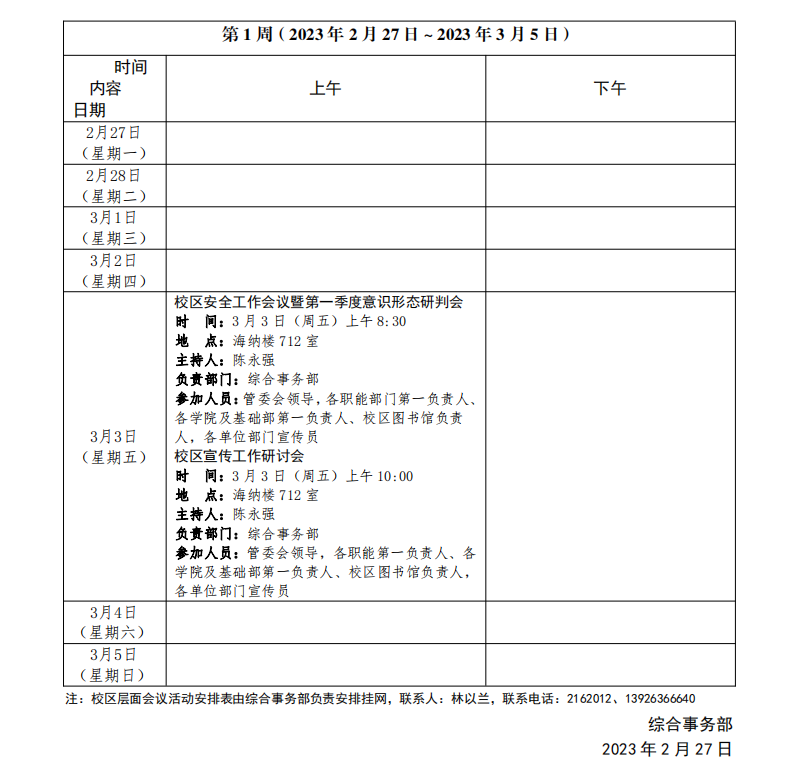 2022~2023学年第二学期第01周会议活动安排表