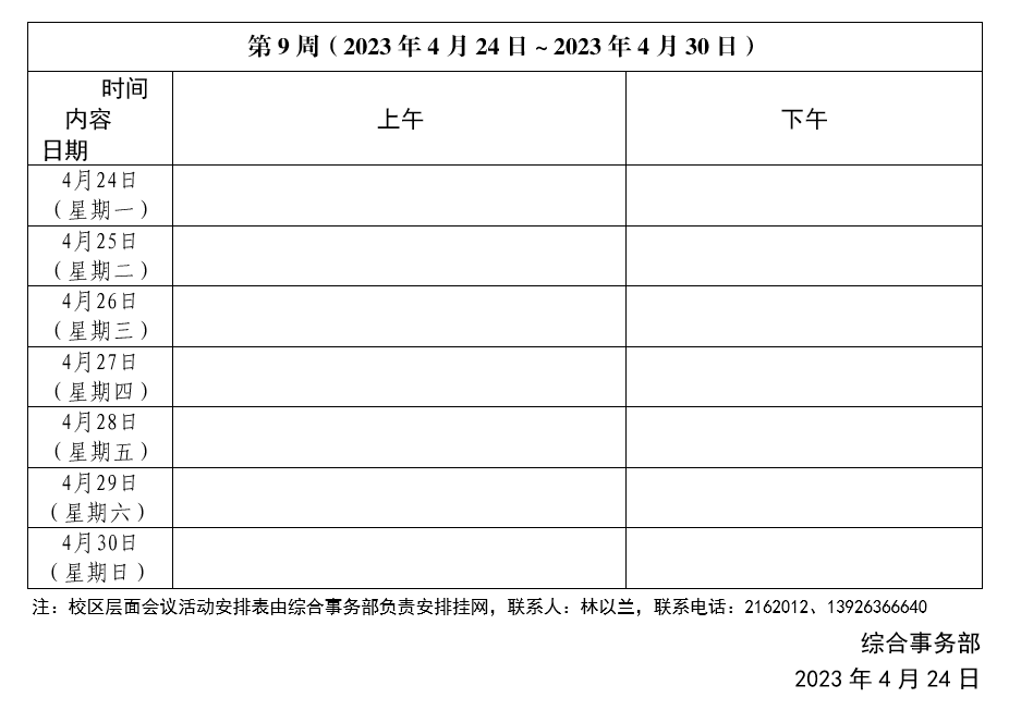 2022~2023学年第二学期第09周会议活动安排表