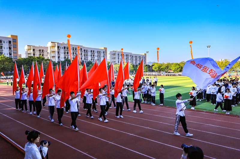 学校党委常委、副校长,阳江校区党委书记、管理办公室主任、第三届田径运动会组委会主任周昌仕出席运动会开幕式并致辞。校区党委副书记、组委会副主任丁永成主持开幕式。在全体师生的共同见证下,国旗队、校旗队、红旗队、裁判员、运动员们身着整齐的队服,精神抖擞地步入会场。伴随着激昂的进行曲,各方阵依次喊着响亮的口号通过主席台,展现了各自的独特风采。