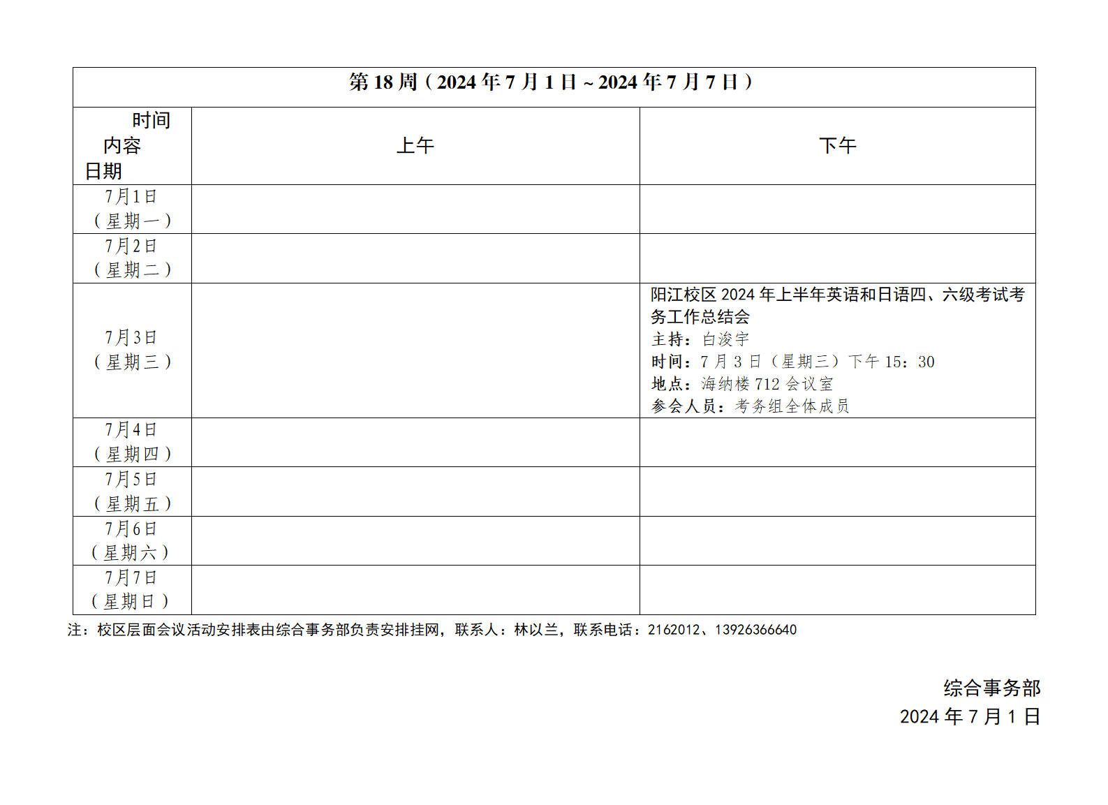 2023~2024学年第二学期第18周会议活动安排表
