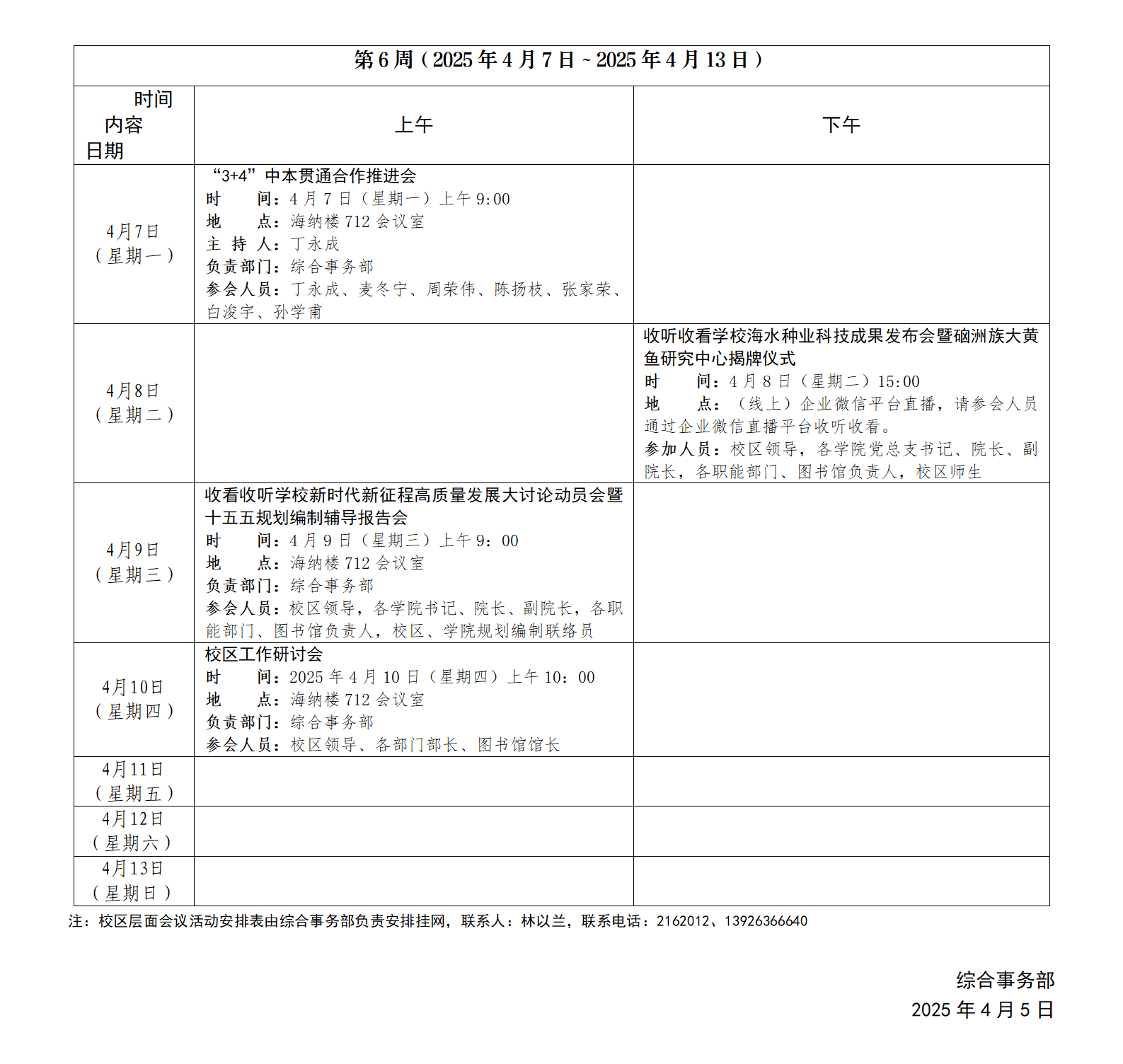 2024~2025学年第二学期第7周会议活动安排表
