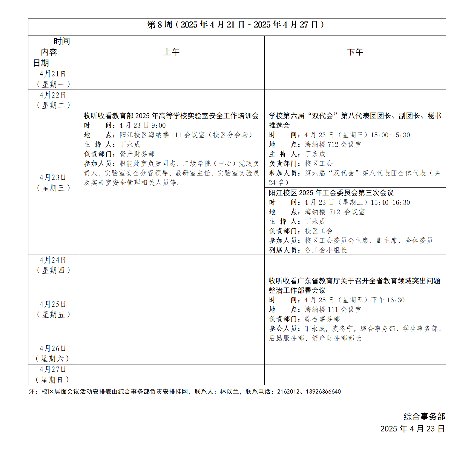 2024~2025学年第二学期第8周会议活动安排表