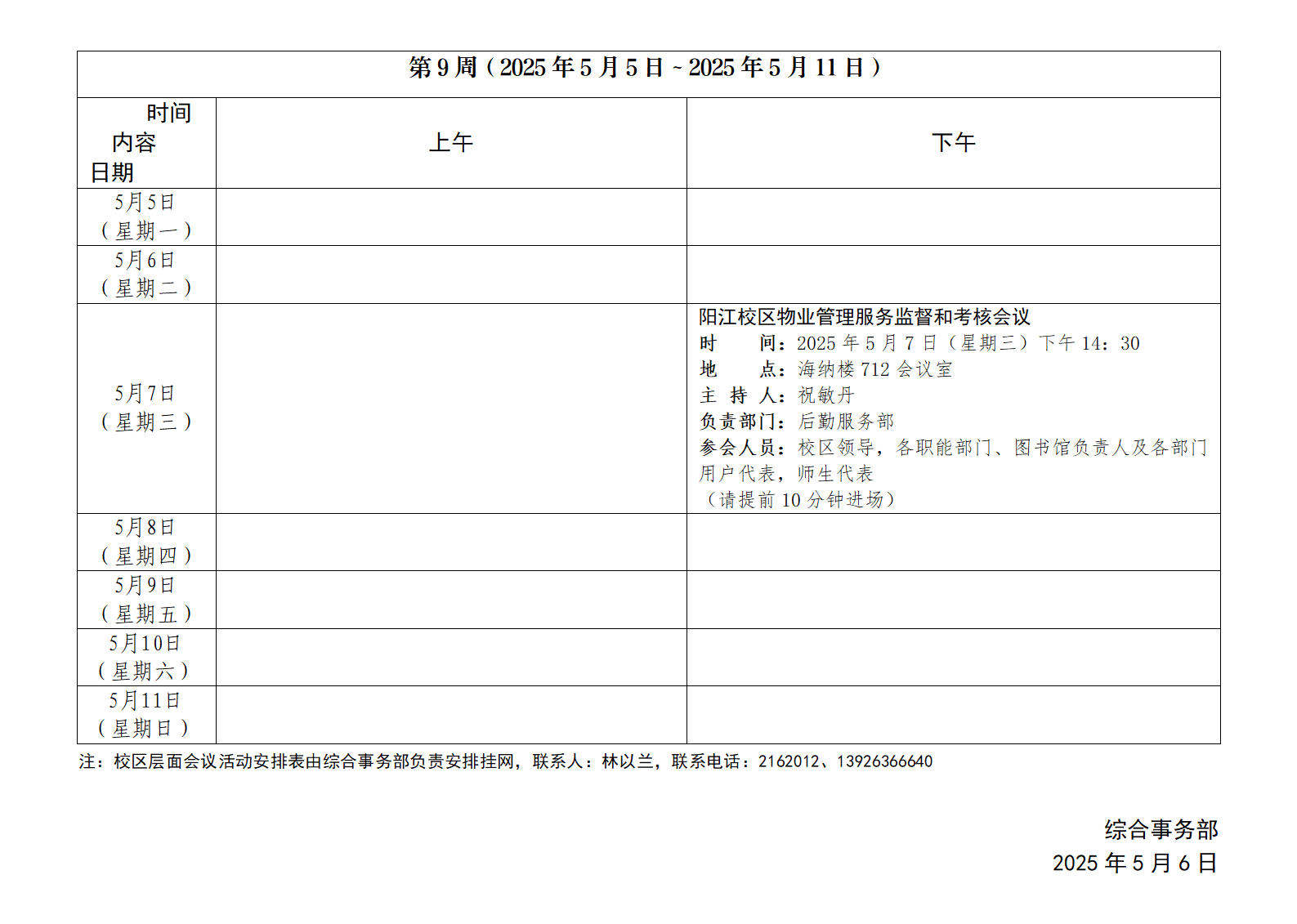 2024~2025学年第二学期第9周会议活动安排表